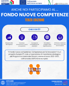 “Il Fondo nuove competenze. Competenze per le innovazioni” è un progetto Europa 27, cioè un’operazione di importanza strategica del Programma nazionale Giovani, donne e lavoro 2021-2027, cofinanziato dall’Unione europea.
